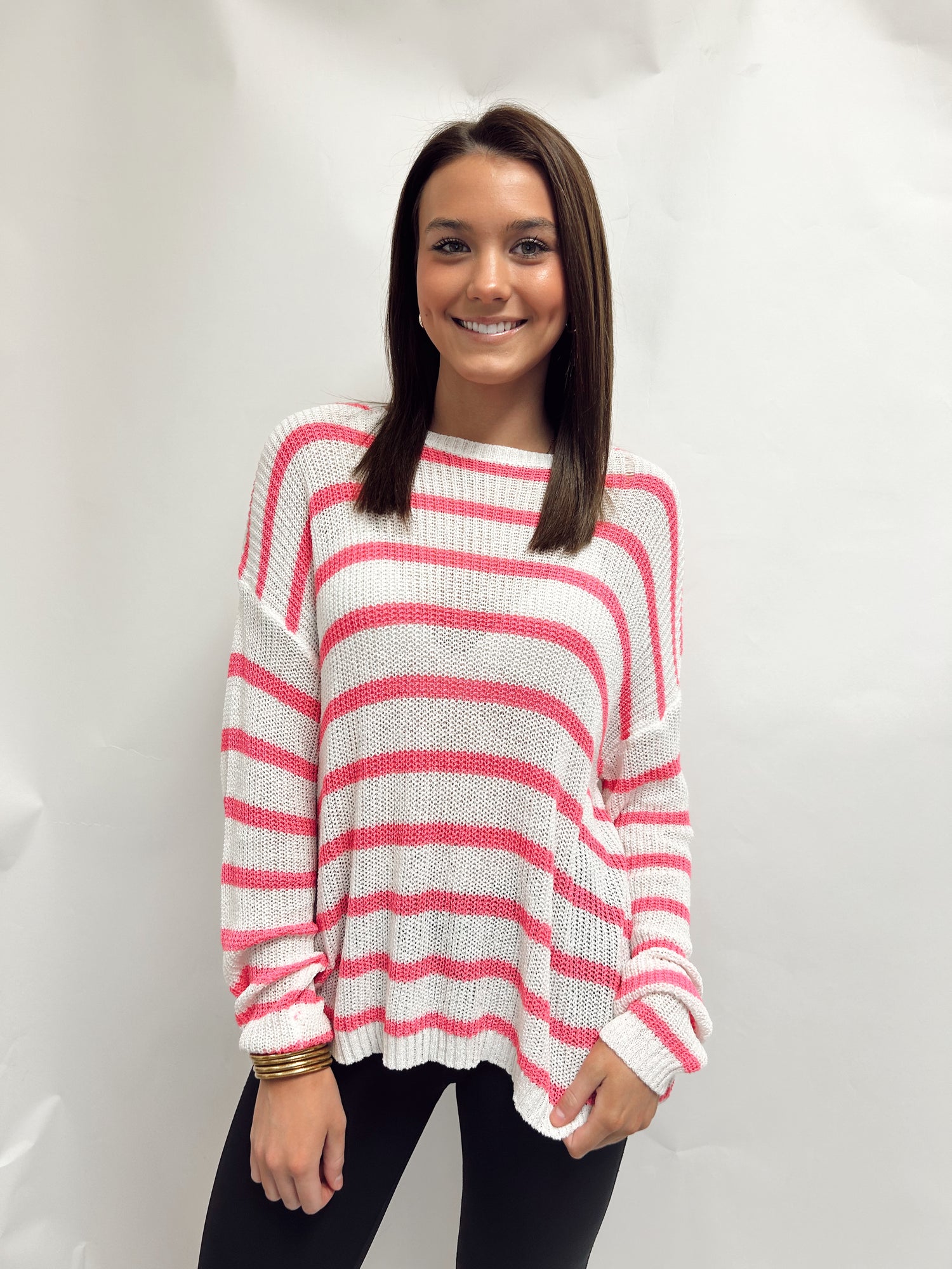 Our light weight waffle knit pink and white striped top is perfect for all things spring and summer!